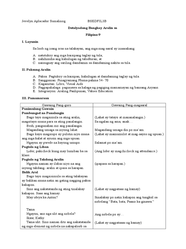 Belen Detalyadong Banghay Aralin Sa Filipino 9 Pdf